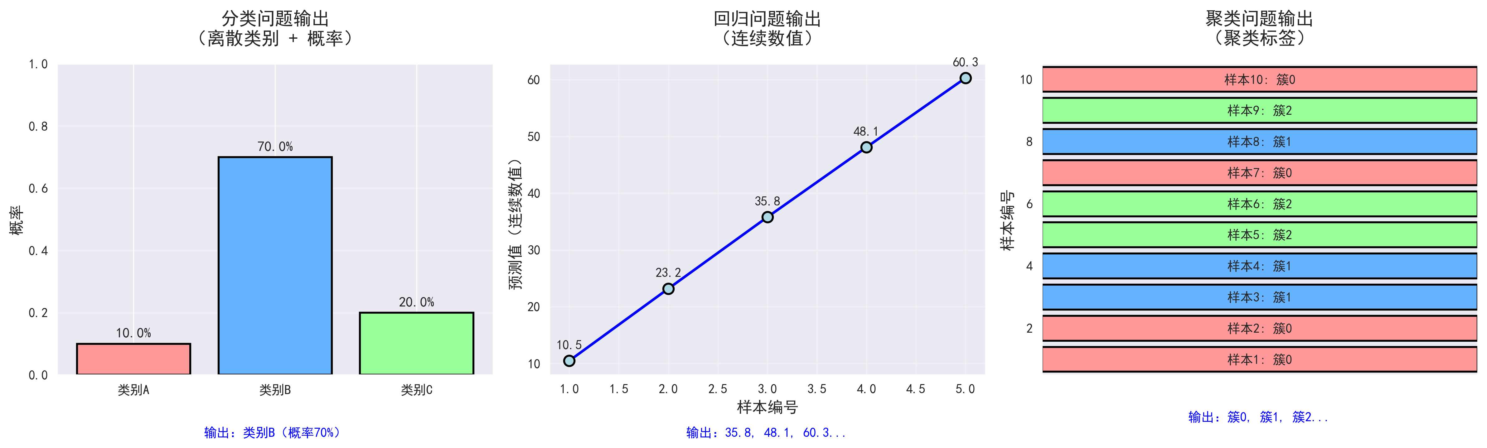 | 输出类型 | 离散类别 | 连续数值 | 离散类别(但未知) |