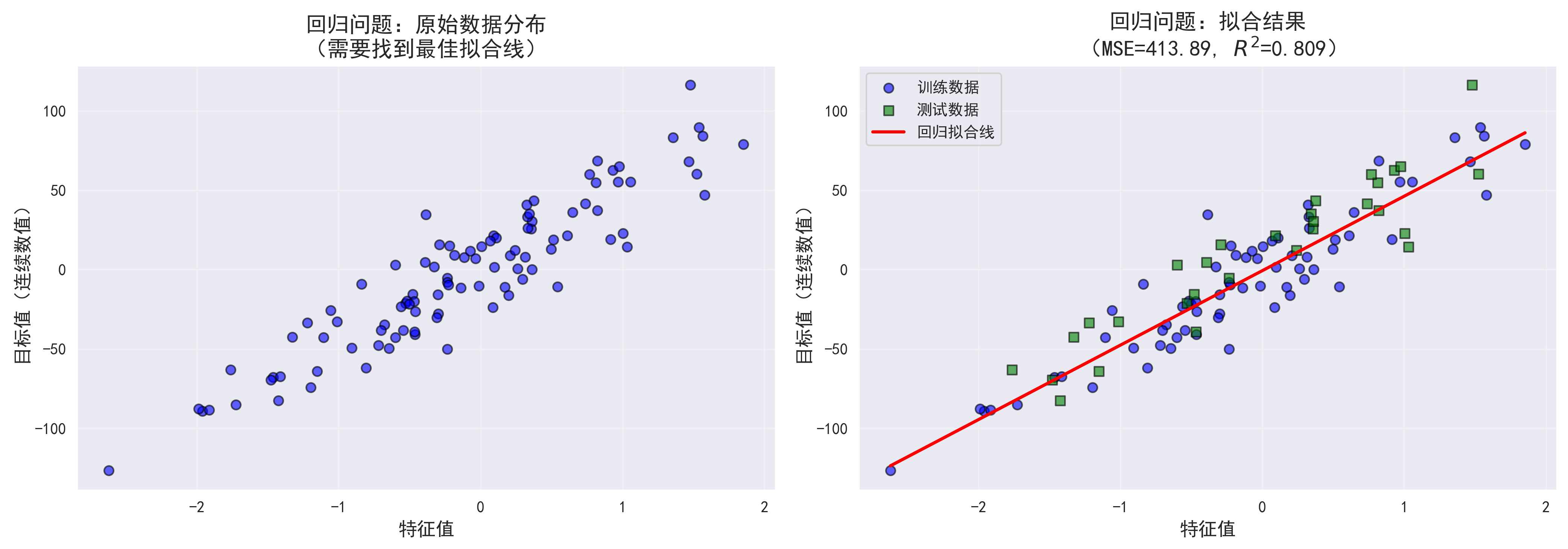定义: 回归问题是预测连续的数值。就像预测一个具体的数量,而不是选择类别。