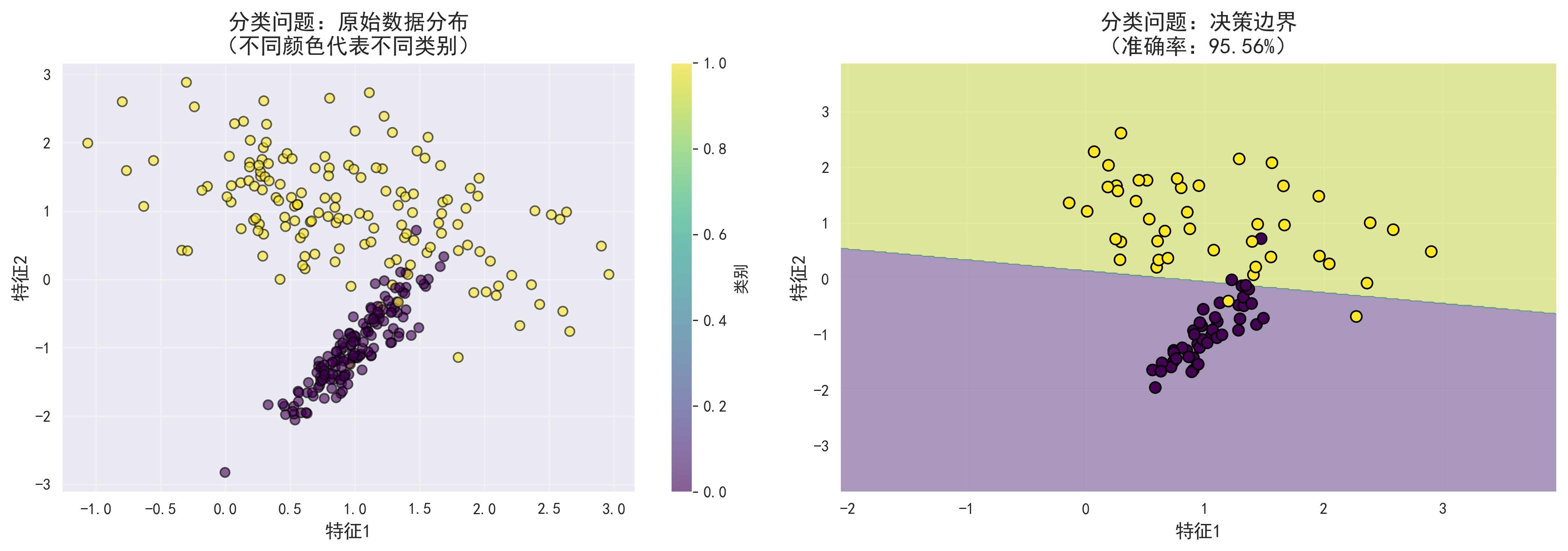定义: 分类问题是预测样本属于哪个离散的类别。就像给物品贴标签,每个样本都会被分配到预定义的某个类别中。