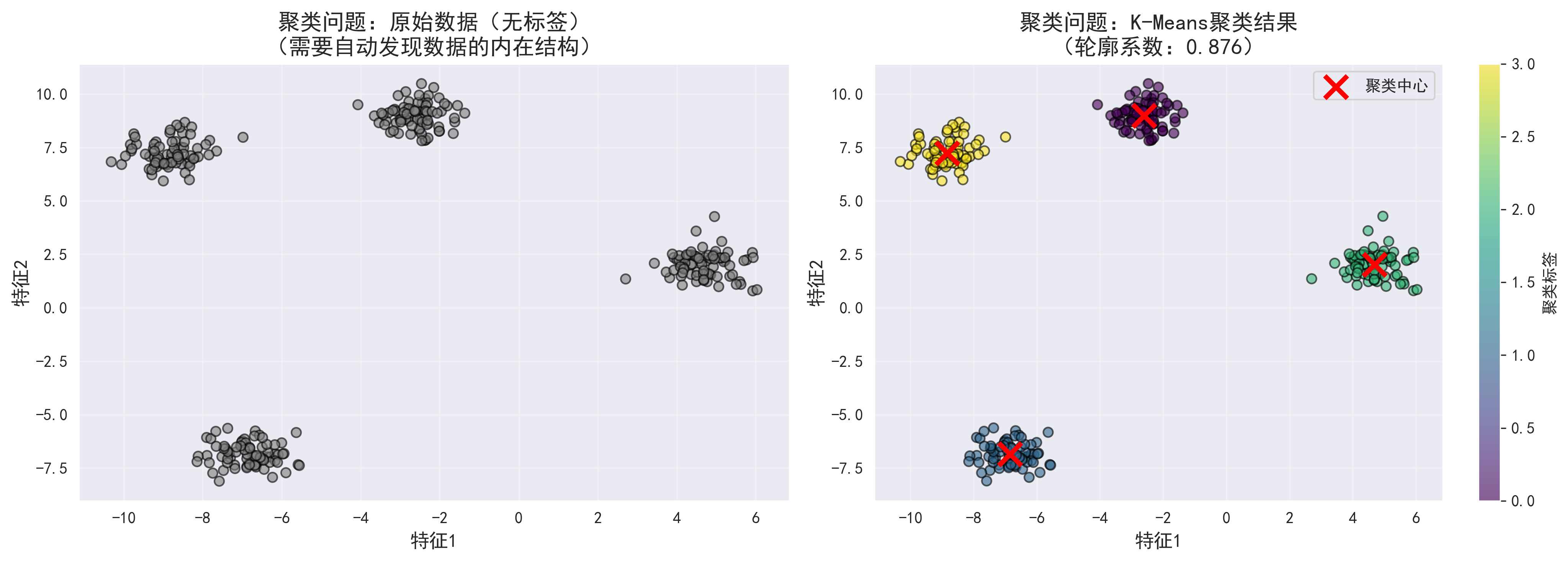 定义: 聚类问题是无监督学习,在没有标签的情况下,将相似的样本自动分组。就像把一堆东西按照相似性自动分类。