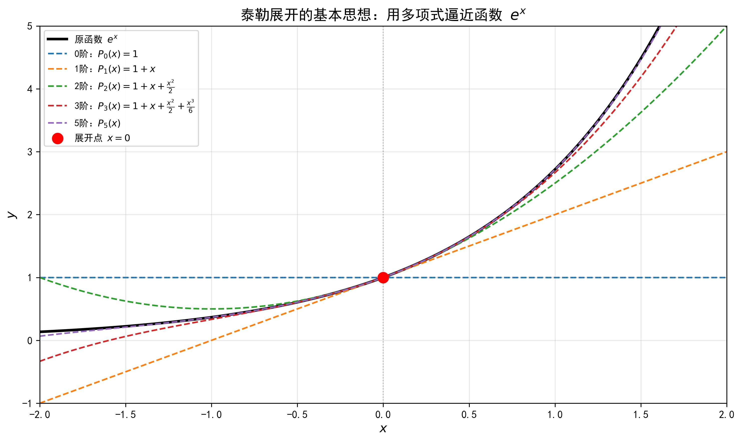 3阶、5阶近似:随着阶数增加,多项式越来越接近原函数 $e^x$