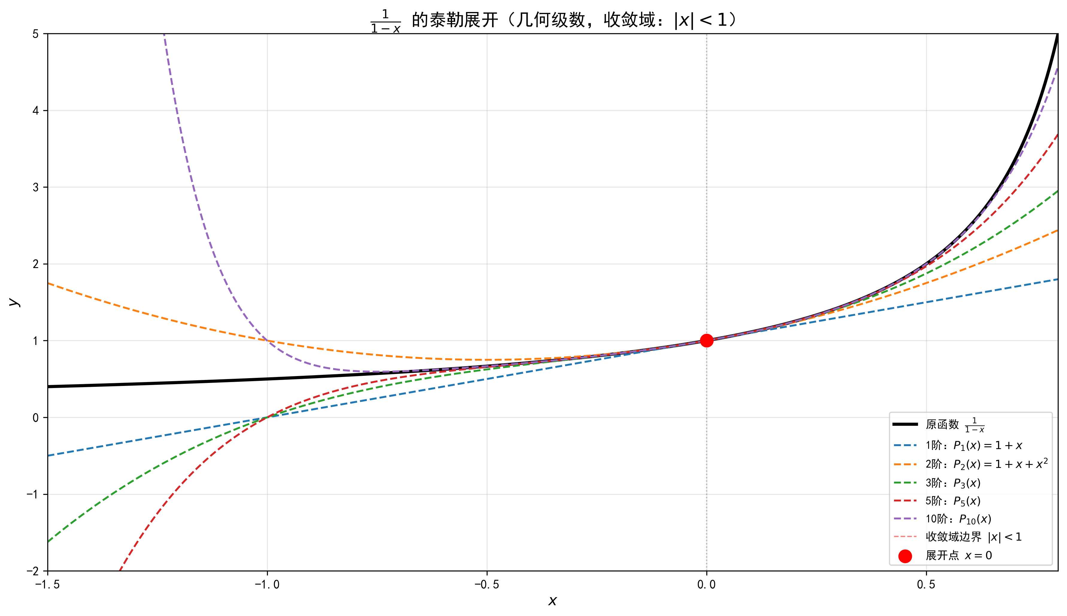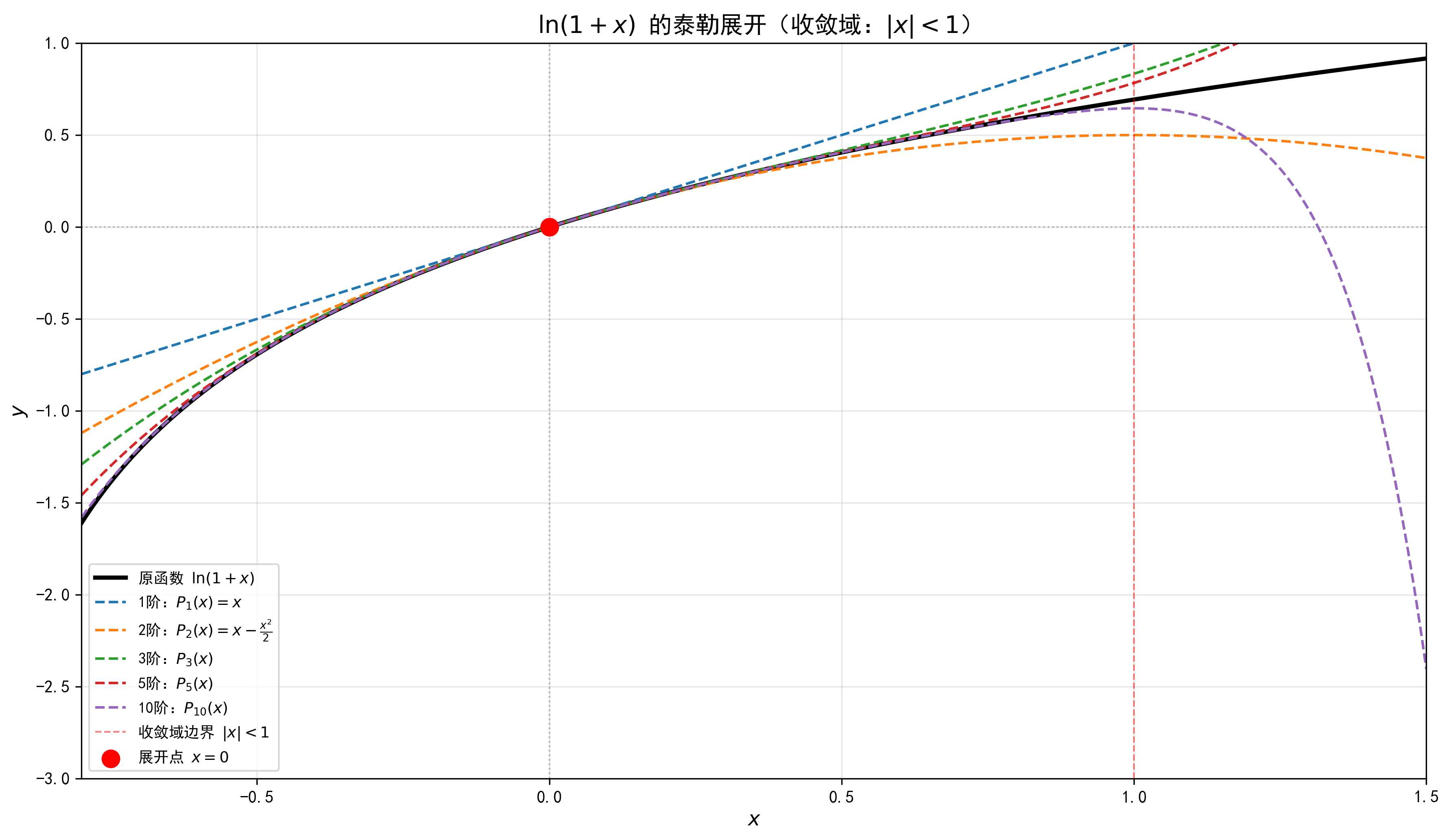 从图中可以看到,在收敛域内($|x| < 1$),多项式很好地近似了 $\ln(1+x)$,但在边界附近需要更高阶的项。