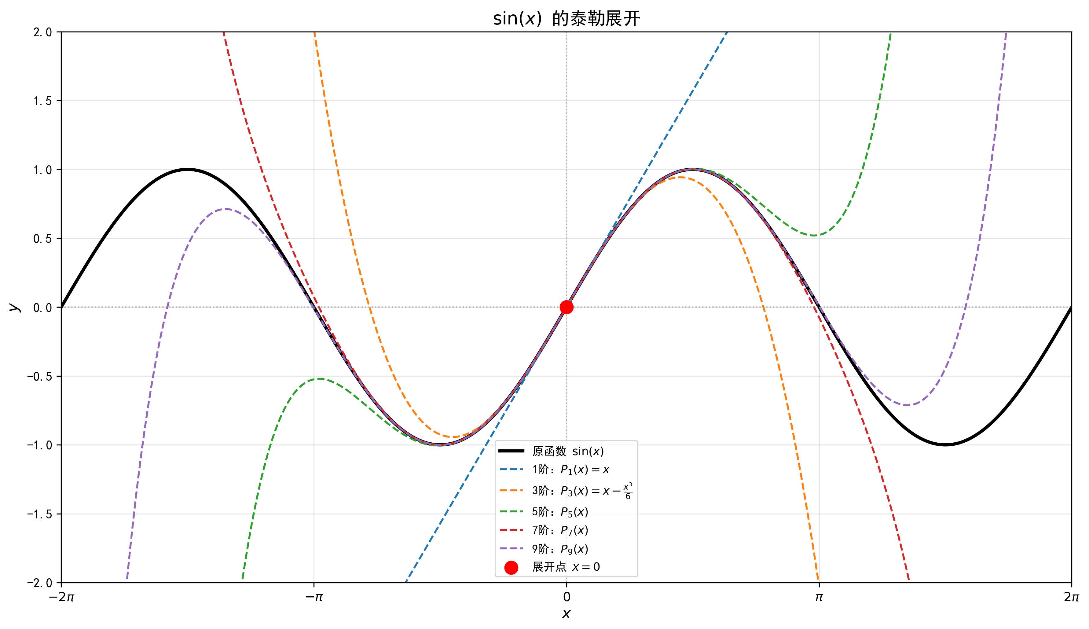 - 在 $x=0$ 处展开:在原点附近最准确,但远离原点时误差增大