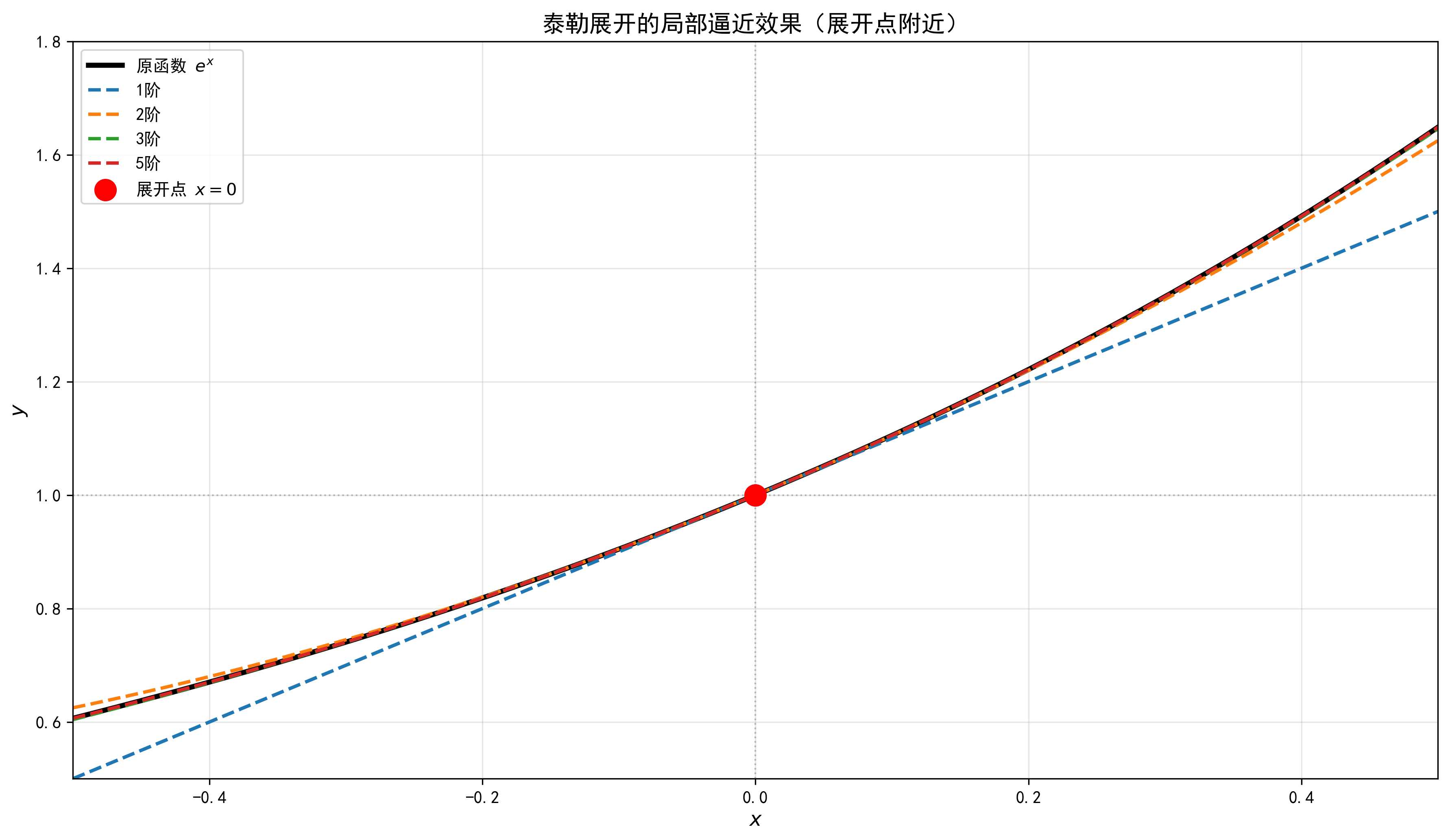 这说明了泰勒展开的局部性质:在展开点附近,即使低阶多项式也能很好地近似原函数。