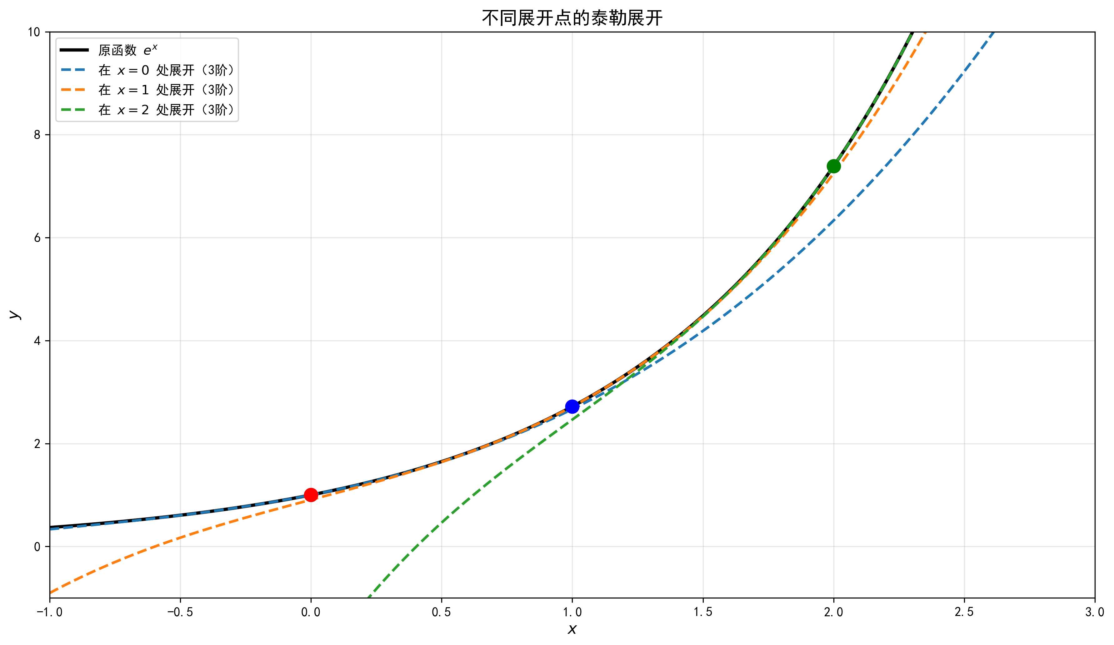 让我们看看在不同点展开 $e^x$ 的效果: