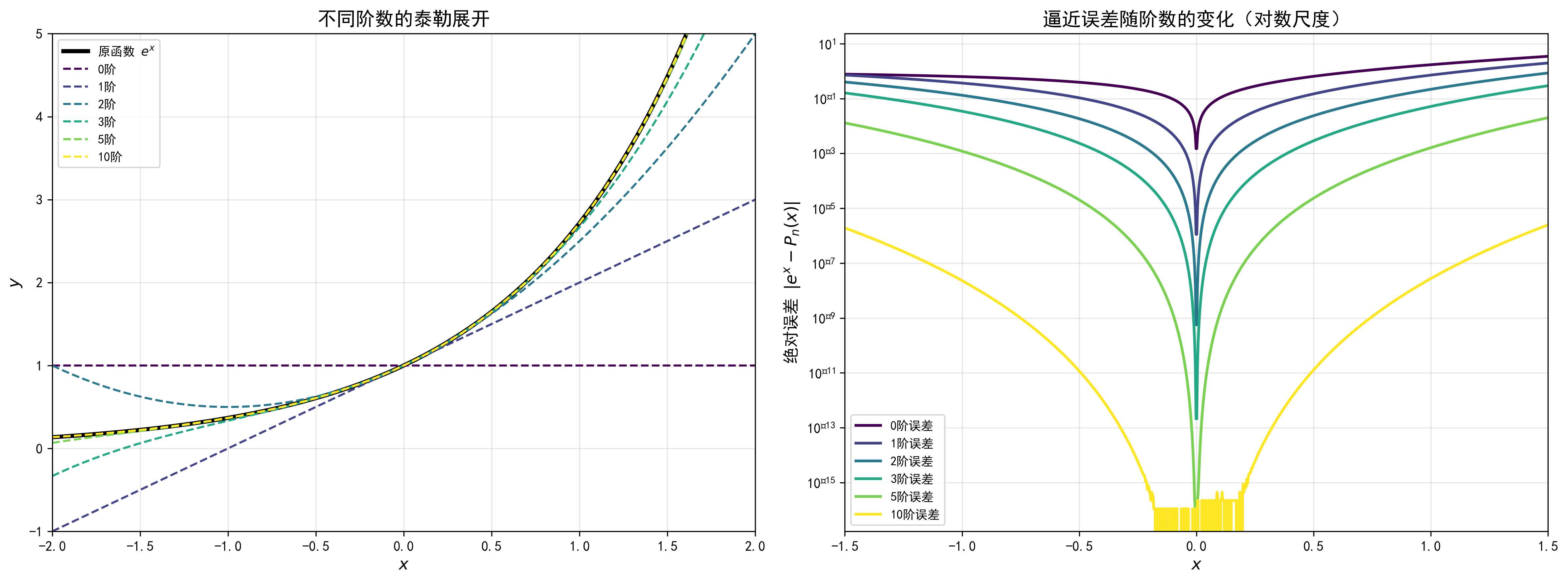 - 误差与 $\frac{1}{(n+1)!}$ 成正比:阶数越高,误差越小(因为阶乘增长很快)