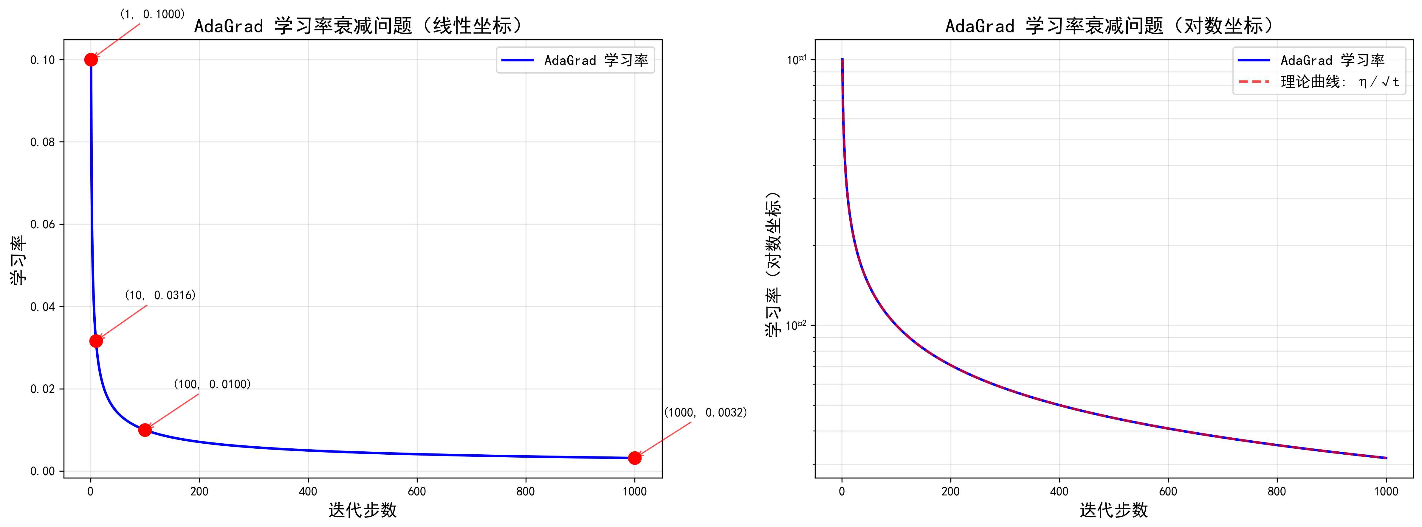 AdaGrad 通过累积所有历史梯度的平方和来自适应调整学习率,但这种方法存在一个严重问题: