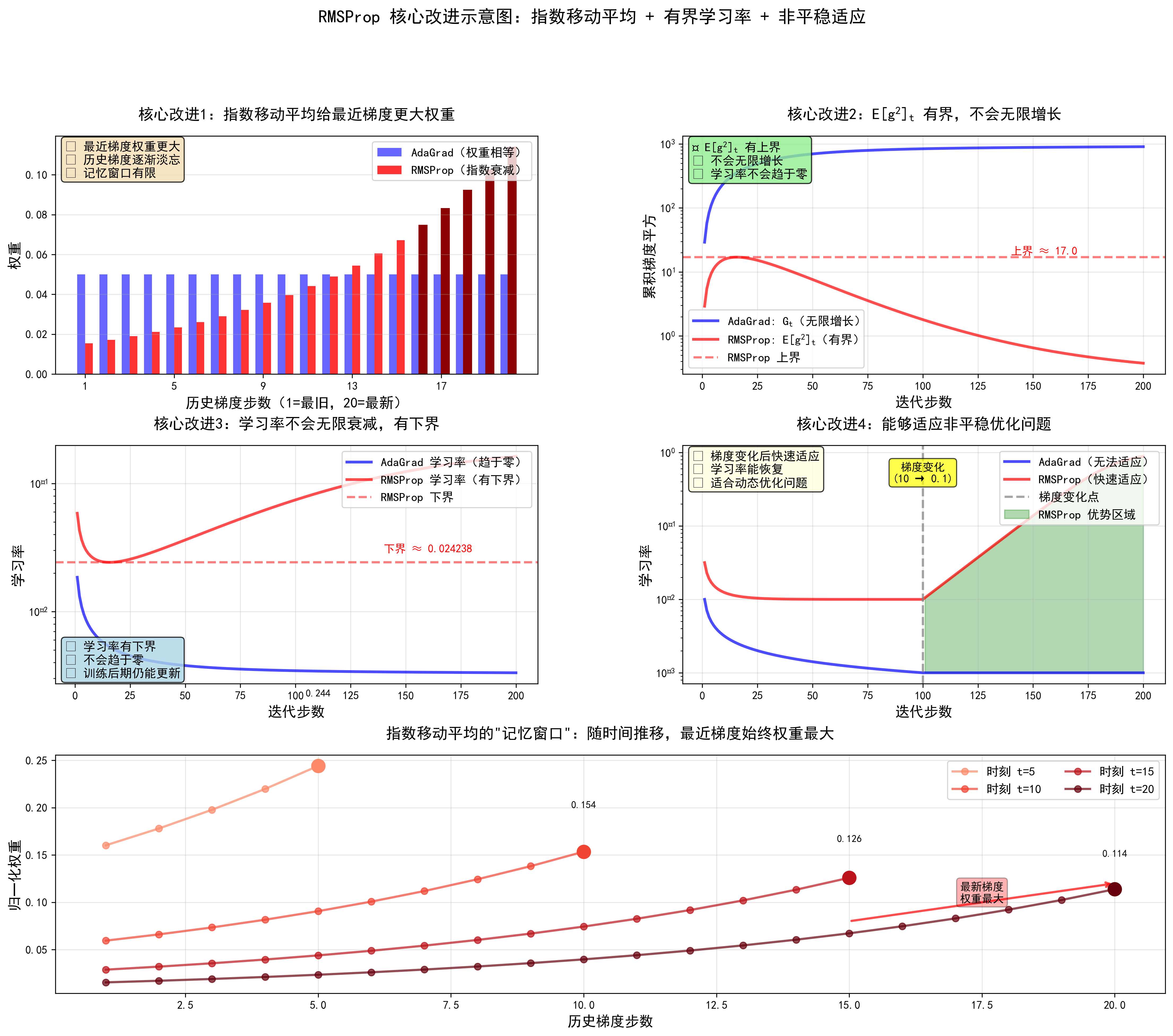 RMSProp(Root Mean Square Propagation)由 Geoff Hinton 提出,通过使用 指数移动平均(Exponential Moving Average, EMA) 来替代简单累加,解决了 AdaGrad 学习率衰减过快的问题。