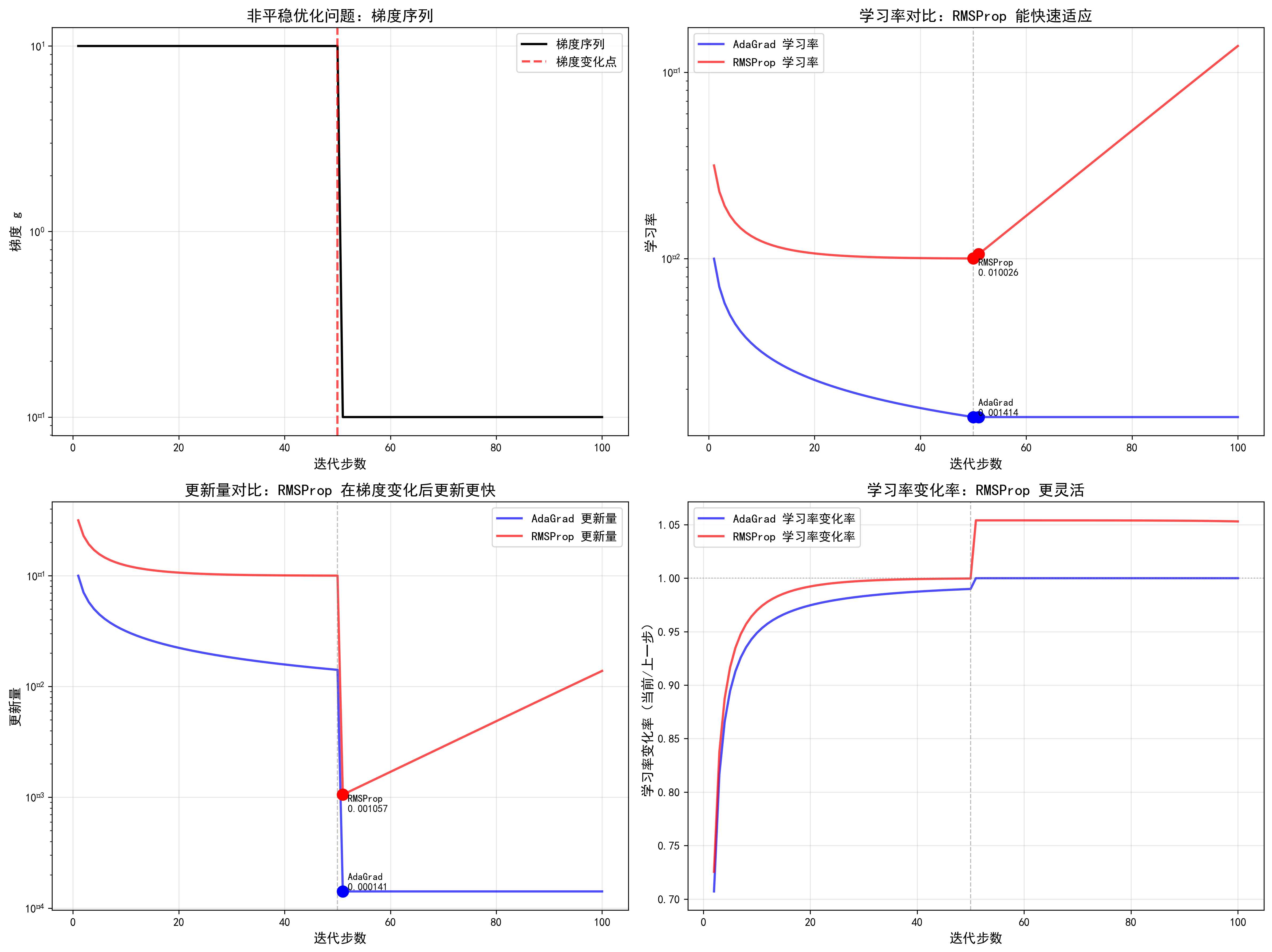 - 无法适应非平稳问题:对于非平稳优化问题(损失函数形状变化),AdaGrad 无法适应