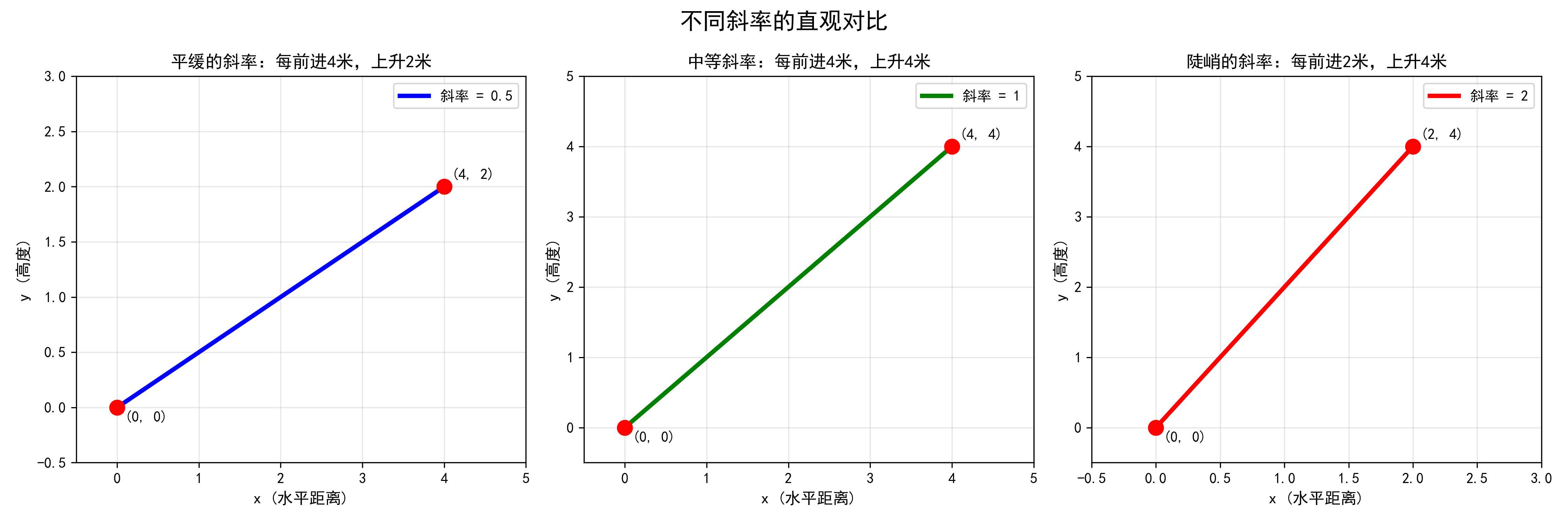 axes[2].set_title('陡峭的斜率:每前进2米,上升4米', fontsize=12, fontweight='bold')