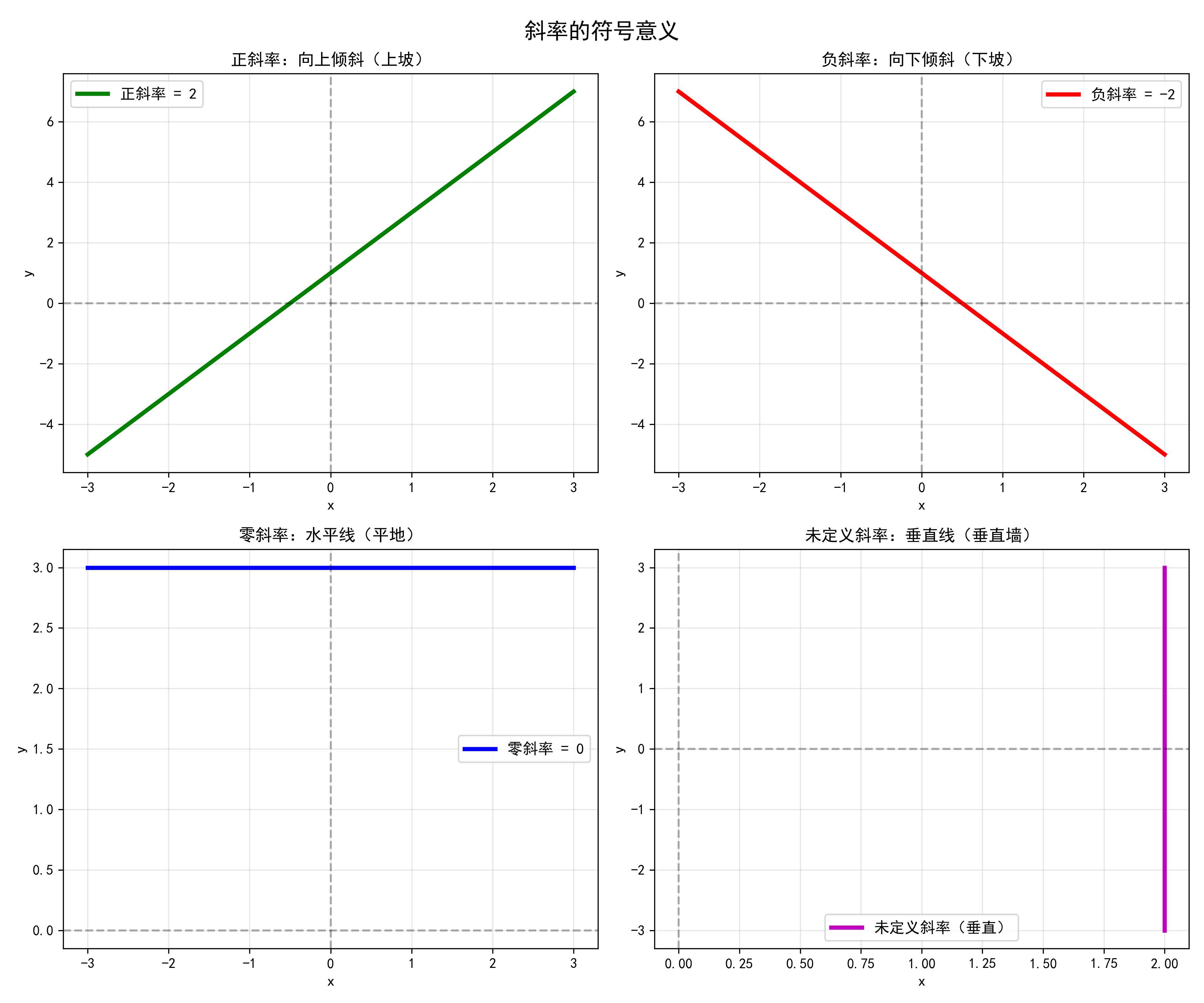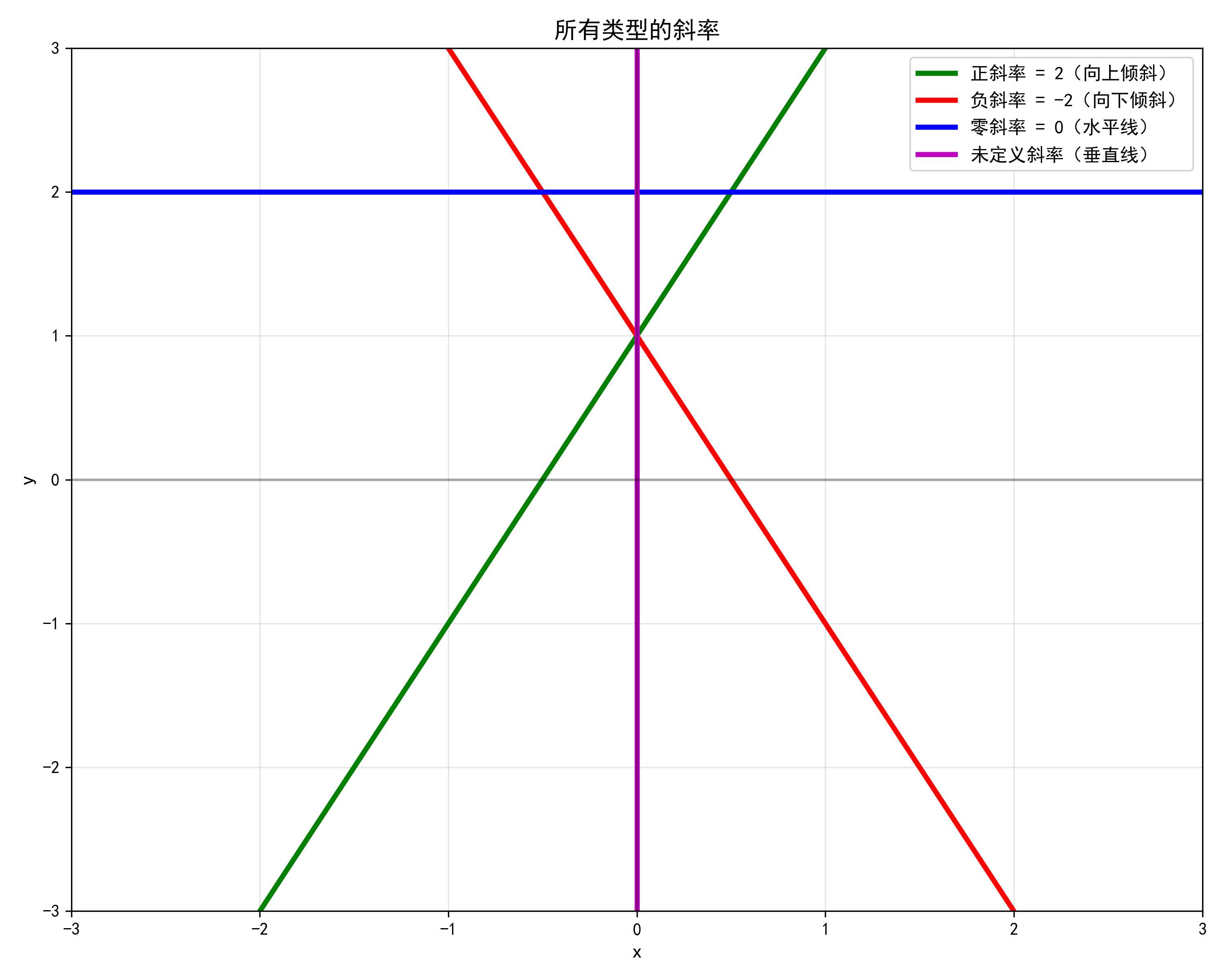 - 除以零:如果 $\Delta x = 0$,斜率未定义(垂直线)