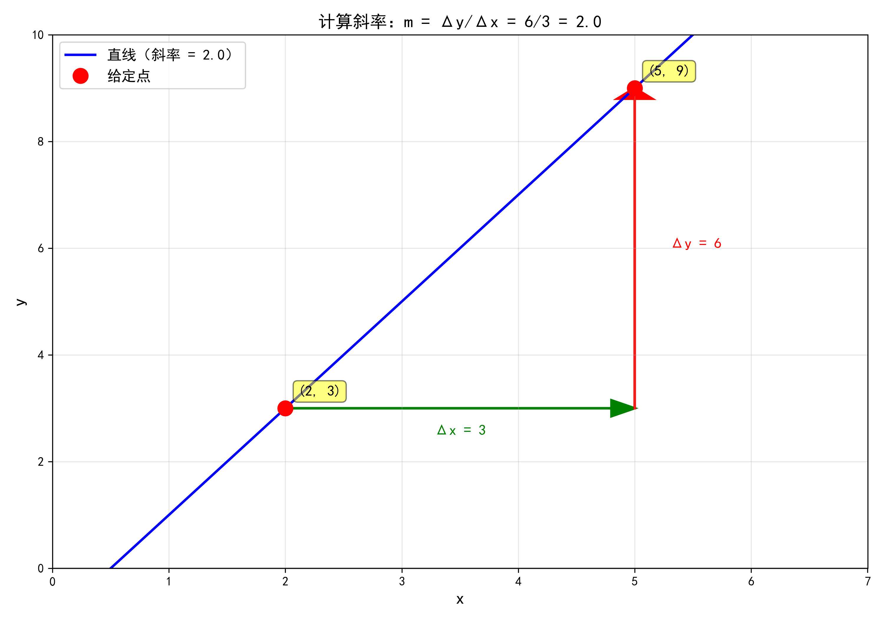 - 计算斜率:$m = \frac{\Delta y}{\Delta x}$